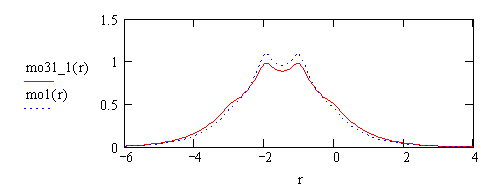 Man erkennt deutlich, dass der zweite Teil der gesplitteten Wellenfunktion breiter (diffuser) ist.