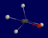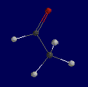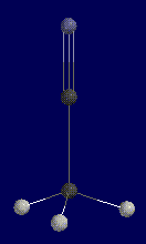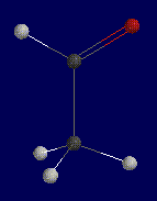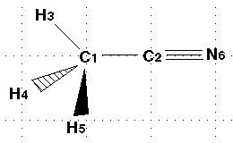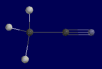 This is Methyl Cyanide. Notice the pyrimidal shape of the three hydrogens and linear geometry of the two carbons and nitrogen. These three atoms form a 180 degree angle and will pose a problem when calculating the z-matrix. |