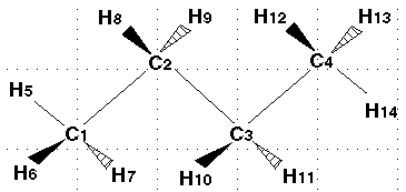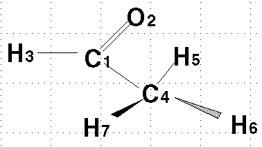 | Here is the numbered molecule. Use this as a reference when following along in the example. Notice that the black arrow means that atom H5 is coming out of the screen and towards you. The shaded arrow H4 is going into the monitor. The atom "X" is the dummy atom. |